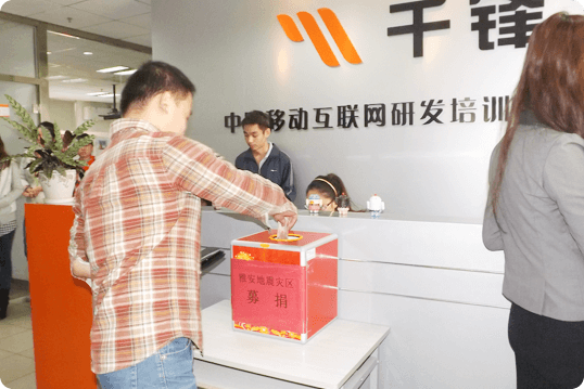千鋒教育發起“雅安,你要平安-為雅安地震災區捐款”的倡議,號召全體員工及學員捐款,通過深圳壹基金公益基金會捐助給災區。