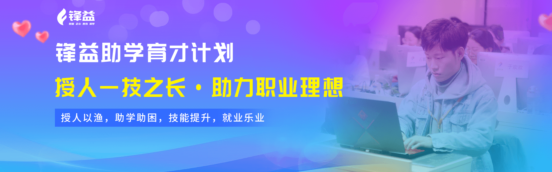 為更好地貫徹落實國家職業教育改革政策,以科技賦能教育,縮短城鄉教育之間差距,更好的推進“鄉村振興”戰略。千鋒教育旗下公益品牌—鋒益聯合中國社會福利基金會,借助騰訊99公益平臺發起授漁計劃·鋒益助學項目,幫助困境中的大學生成長、成才、就業、樂業,為他們提供教育資助和求學生活費用資助。